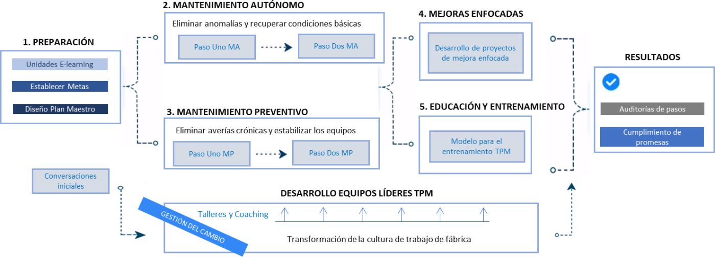 - Estudio y mentoría para implantar los pilares TPM acordados con el cliente