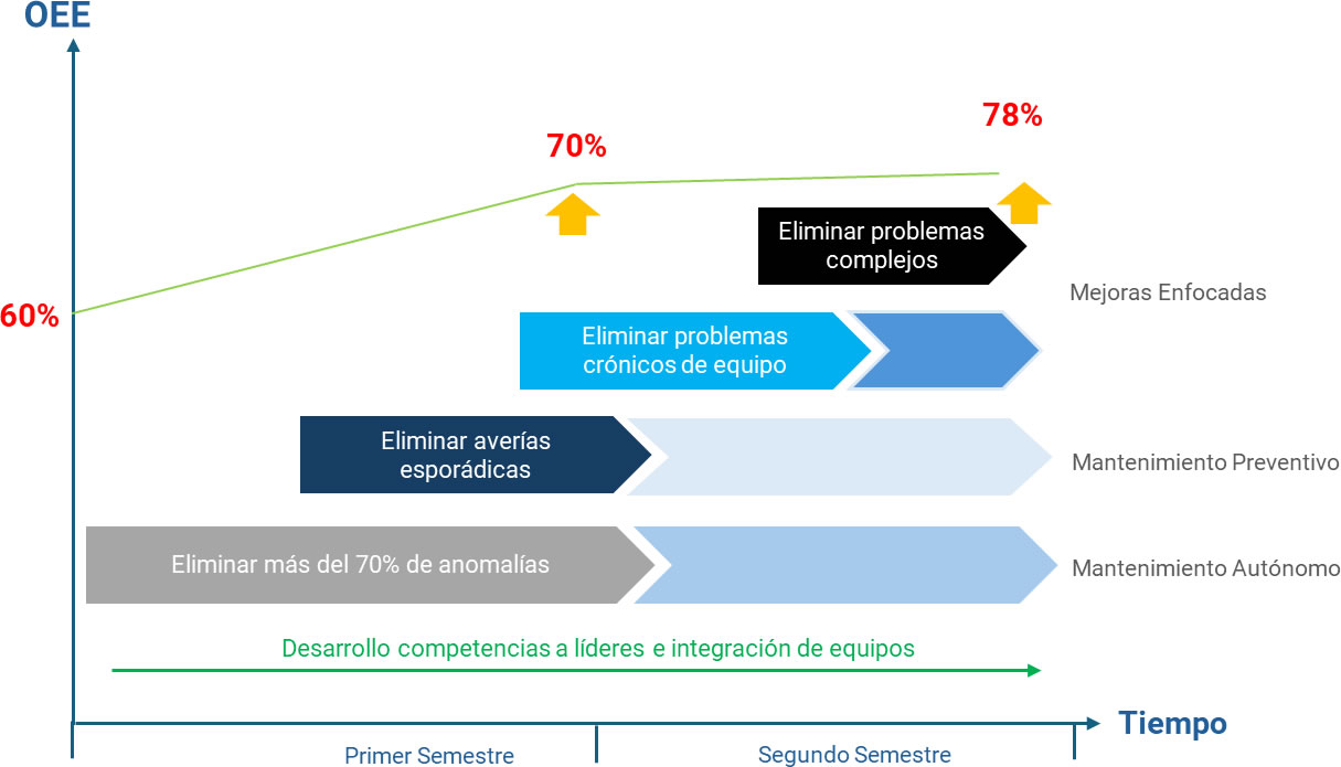 Nos comprometemos a ayudarte a mejorar más del 10% de OEE en un año a través del buen uso de las metodologías TPM, fortaleciendo las competencias de liderazgo y gestión de los equipos y desarrollando una cultura de trabajo fundamentada en el compromiso, mejora continua y gestión autónoma.