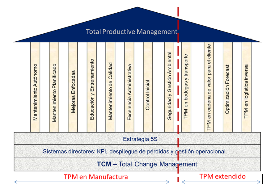 El TPM ampliado traslada los pilares fundamentales del modelo clásico, como la eliminación de pérdidas, la participación de todos los niveles de la organización y la autonomía operativa, a las distintas áreas de la logística. Estas incluyen el almacenaje, el transporte y la distribución, la logística inversa, la planificación de la demanda (forecast), así como la gestión de proveedores y de flujos de camiones. Este enfoque busca no solo evitar fallos técnicos, sino también reducir todas las formas de desperdicio logístico, mejorar el flujo de información y materiales, y elevar la satisfacción del cliente.