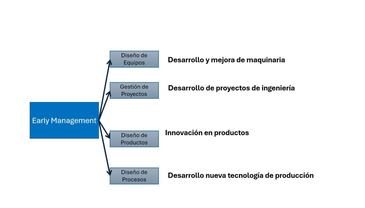 Estos enfoques son especialmente valiosos en industrias que atraviesan procesos de renovación tecnológica, digitalización o automatización, donde se exigen niveles cada vez más altos de fiabilidad y disponibilidad. Early Management permite construir estos estándares desde el diseño, no después del primer fallo. Además, Early Management se puede utilizar como modelo “core” para el diseño e ntroducción de nuevos productos. Puede ser acompañado con otro tipo de tecnologías de soporte como Ingeniería Kansei para diseñar productos con alto contenido emocional, tecnologías postponement para la introducción de nuevos productos personalizados y proyectos con alto contenido tecnológico digital.