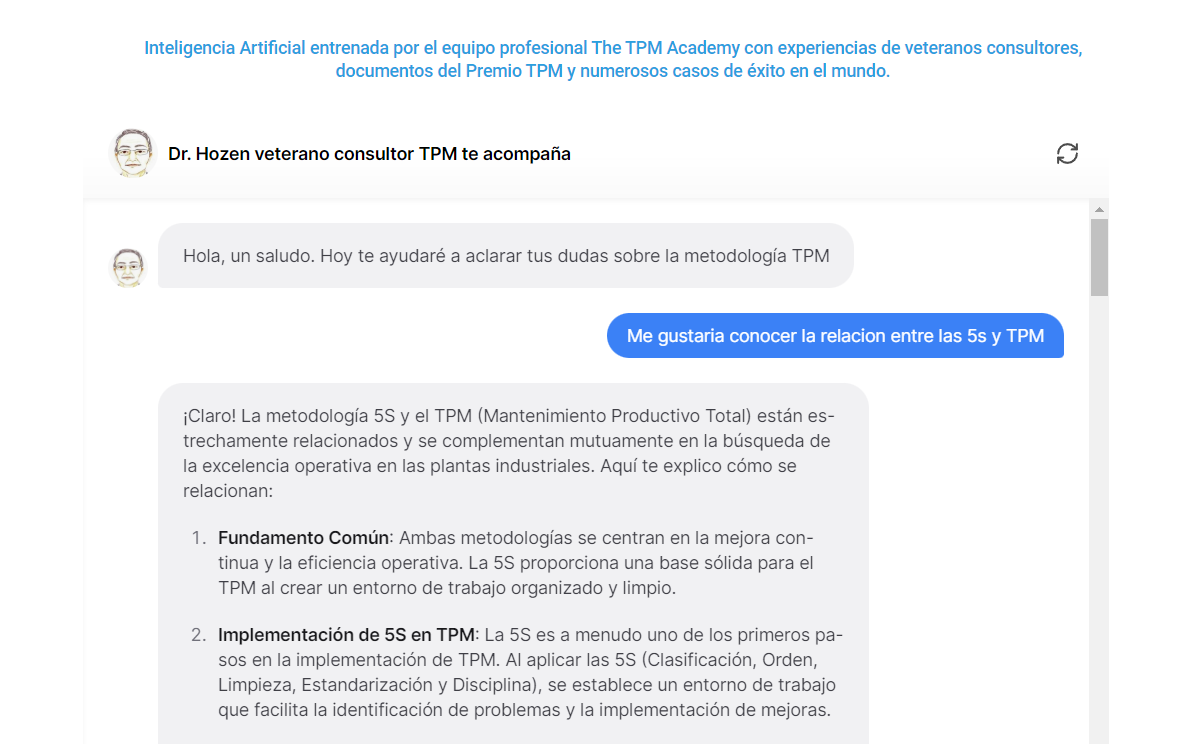 Hemos entrenado nuestro Chatbot de Inteligencia Artificial con cientos de documentos sobre TPM, metodología del Premio TPM, casos de éxito en el mundo, y notas de nuestra dilatada experiencia de más de treinta años como consultores TPM, para que cuentes con un soporte en todo momento, y que te ayudará a resolver tus preguntas sobre el proceso de desarrollo de la metodología TPM.